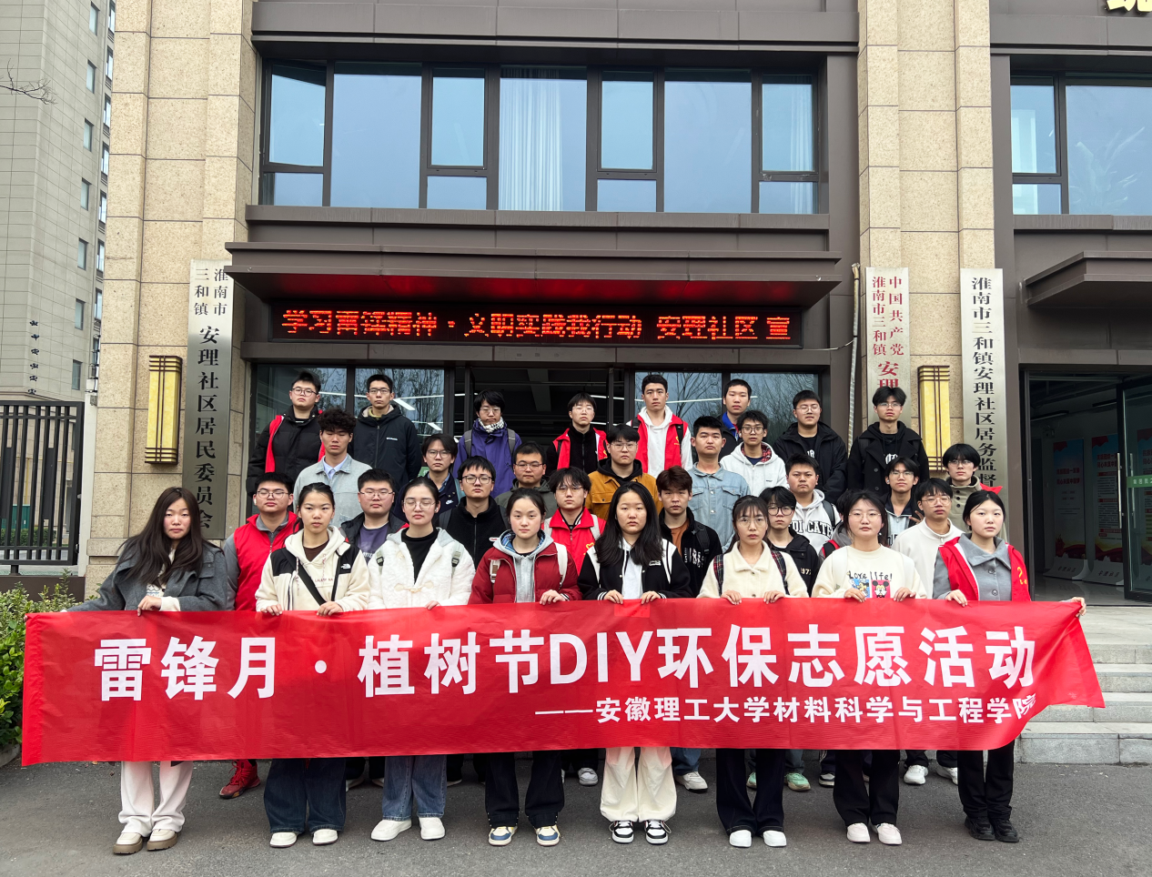 为弘扬新时代雷锋精神,引导同学深入学习宣传贯彻习近平生态文明思想,动员社会各界牢固树立和践行绿水青山就是金山银山的理念。材料学院于3月12日上午在淮南市三和镇安理社区开展了“雷锋月・植树节环保DIY主题活动”。本次活动形式多样、内容丰富,为传播环保理念、践行雷锋精神贡献了积极力量。