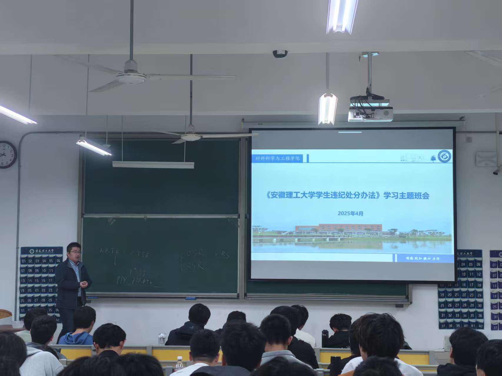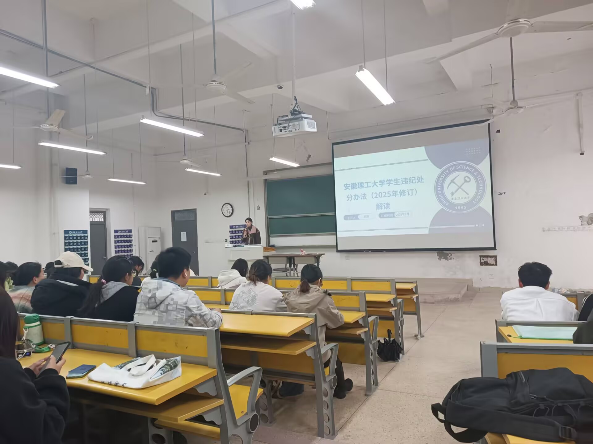 为了引领学生树立规矩意识,帮助大家更好地理解学校规章制度要求,针对学校新印发《安徽理工大学学生违纪处分办法(2025年修订)》,近期,材料科学与工程学院组织各年级相继开展“学条例、明事理、遵校纪、守校规”主题宣讲,带班辅导员主讲,学院全体本科生参加。