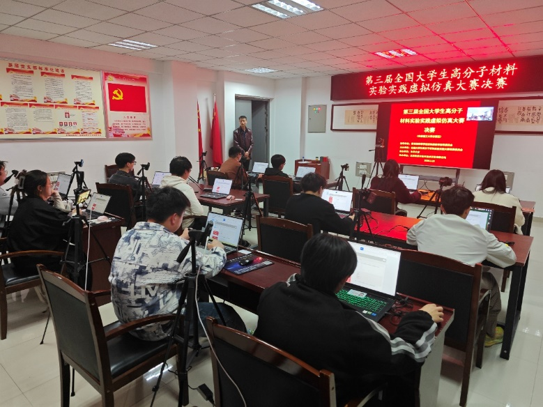 安徽理工大学分赛区设在材料科学与工程学院高分子材料与工程专业,专业对大赛组织工作予以高度重视,从赛前筹备、竞赛培训到赛事执行,各个环节均精心布置。并通过班级群推送以及举办宣讲会等多元渠道,向学生全面宣传大赛,深度解读赛事意义与奖励机制,充分调动学生参赛热情,踊跃报名参赛。竞赛培训阶段,紧密结合高分子材料学科前沿趋势与实验教学实际需求,指导教师们细致讲解理论知识及虚拟仿真操作技巧,涵盖从基础操作流程到复杂实验场景应对等多个方面,助力学生全方位熟悉平台,从容备赛。同时,为深入了解和深度融入比赛,领队教师积极主动与承办单位及各参赛院校深入交流,明确赛事流程与关键节点及注意事项,为比赛的高效、有序开展筑牢坚实基础。