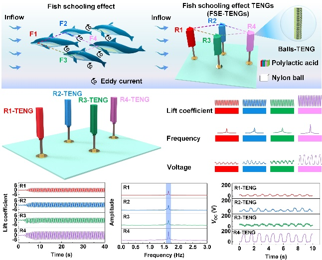 摩擦纳米发电机(TENGs)因有效将涡激振动能量转化为电能而受到广泛关注。对于TENGs的实际应用而言,优化钝体阵列设计以提升输出性能至关重要。然而,阵列中各钝体之间的相互振动干扰会显著降低流体动能转换效果,从而导致阵列能量收集性能的大幅下降。针对上述问题,基于鱼群游动过程中个体间协同能量传递机理,提出了一种鱼群效应TENGs阵列(FSE-TENGs)用于流体能量捕获与利用。通过数值仿真分析了钝体阵列间的相互扰动机制,并基于鱼群效应设计的钝体阵列能够有效抑制这种扰动现象。同时,FSE-TENGs展现出类似鱼群运动中的能量捕获与传递能力:下游钝体TENGs可高效利用上游钝体产生的尾流能量,从而显著提升整体能量收集效果。这一设计策略不仅为TENGs阵列的优化布局提供新的思路,也为陆地或水下多体协同运动编队的设计等工程应用提供了重要的技术支撑。