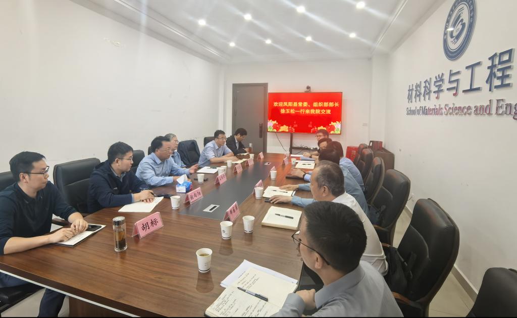 9月25日,凤阳县组织部部长徐玉松、科技局局长陈克斌一行到我校开展合作交流,材料学院副院长王庆平(主持工作)主持交流会,校党委常委、纪委书记、监察专员王献余、校科研部副部长张向阳参加了交流会。