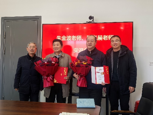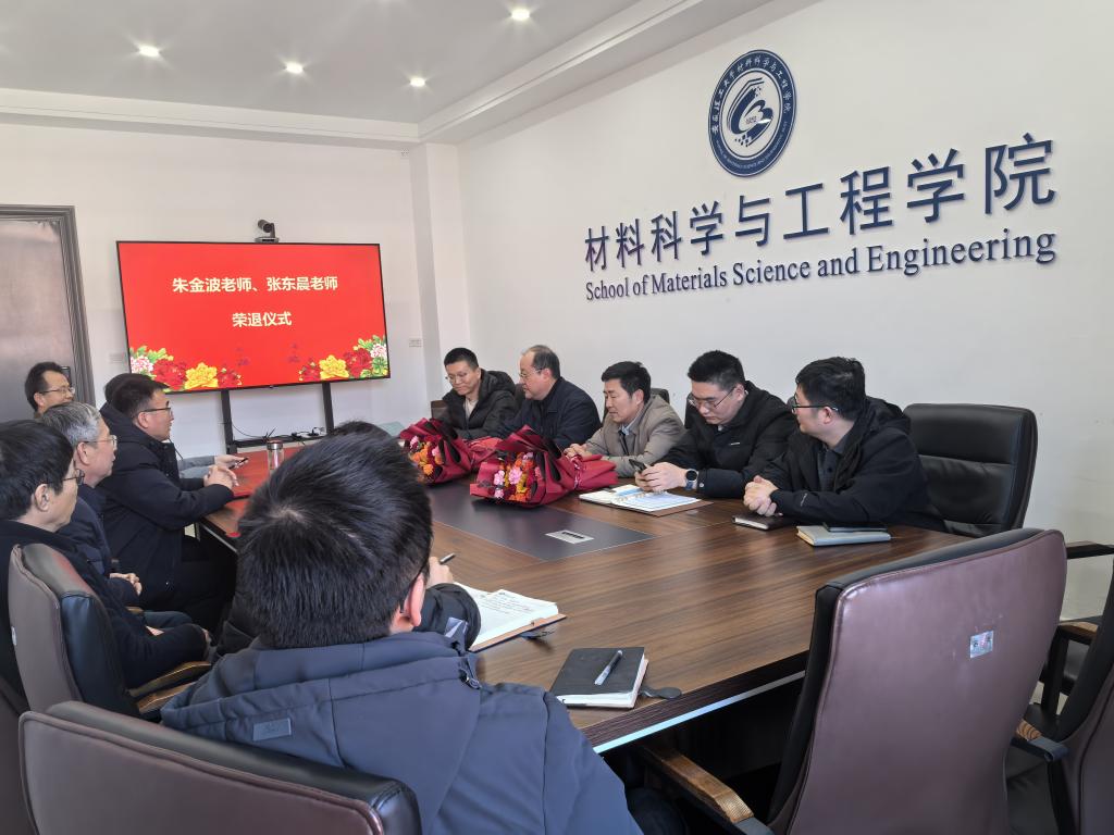 今朝功成身退去,笑看杏坛后来人。11月19日上午,材料科学与工程学院在A312会议室为朱金波教授、张东晨教授隆重举行荣退仪式。学院教师代表齐聚一堂,共同向为学院发展倾注毕生心血的两位老教师表达崇高的敬意与真挚的祝福。学院党委书记陈满乾,副院长程国君、胡标出席仪式,副院长王庆平(主持工作)主持仪式。
