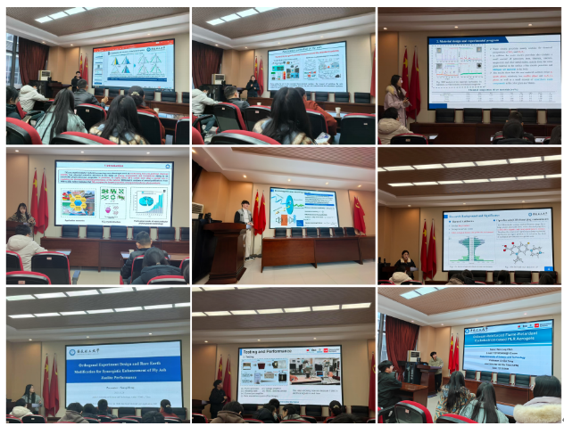 报告会上,9名学生依次围绕材料科学前沿方向分享研究成果。内容涵盖合金材料、光电材料、吸波材料、防火材料、阻燃材料、吸附材料、催化材料、气凝胶及柔性纳米发电机等多个前沿领域,体现了学生扎实的专业能力和国际化学术视野。