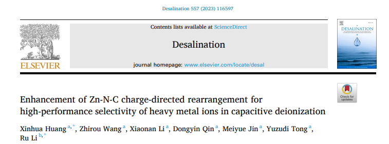 该课题组在引入非氧化还原的单原子Zn在氮掺杂碳材料中,进一步提高氮活性位的电荷密度,从而优化了电极材料对重金属离子的吸/脱附能力,并实现对特定重金属离子的选择性吸附,相关研究成果以“Enhancement of Zn-N-C charge-directed rearrangement for high-performance selectivity of heavy metal ions in capacitive deionization”为题,发表在Desalination (2023, 557, 116597)。