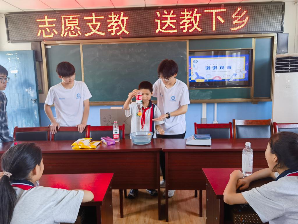 7月10日,筑梦者支教队前往孤堆回族乡中心小学开展科普实验进课堂活动,一群五年级的小朋友坐的整整齐齐等待着志愿者们。志愿者们通过利用矿泉水瓶和乒乓球演示水吸乒乓球实验,让学生们看见了神奇的气压压强差,并邀请学生动手操作,找寻试验感受,并且引发学生思考日常生活中,利用大气压强差的具体应用。志愿者们利用家用淀粉演示非牛顿流体实验,让小学生感受到了遇强则强,遇弱则弱的物理现象,并实验原理与生活经验相结合,引导小学生合理面对压力,以乐观的心态迎接挑战。最后,志愿者们结合日常常见现象解答了神奇的物理化学原理,让学生知其然并知其所以然,激发学生科学探索的欲望,通过讲述安徽科学家们的科研故事,引导小学生要善发现、常思考、多动手,能够保持对科学的热爱,并从小实验开始探索。