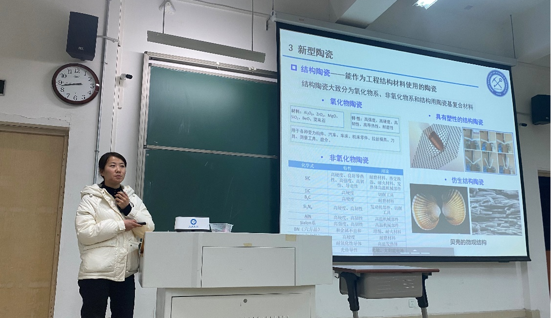 赵晓青老师为学生科普性地讲解了陶瓷材料贯穿千年的发展历史和未来展望,穿插了一些具有代表性和前瞻性的科研实例和视频,让学生在懵懂中留下对陶瓷文化及其高科技制品的深刻印象,加深了大家对所学专业的了解与认识,为今后的专业学习开启了良好开端。