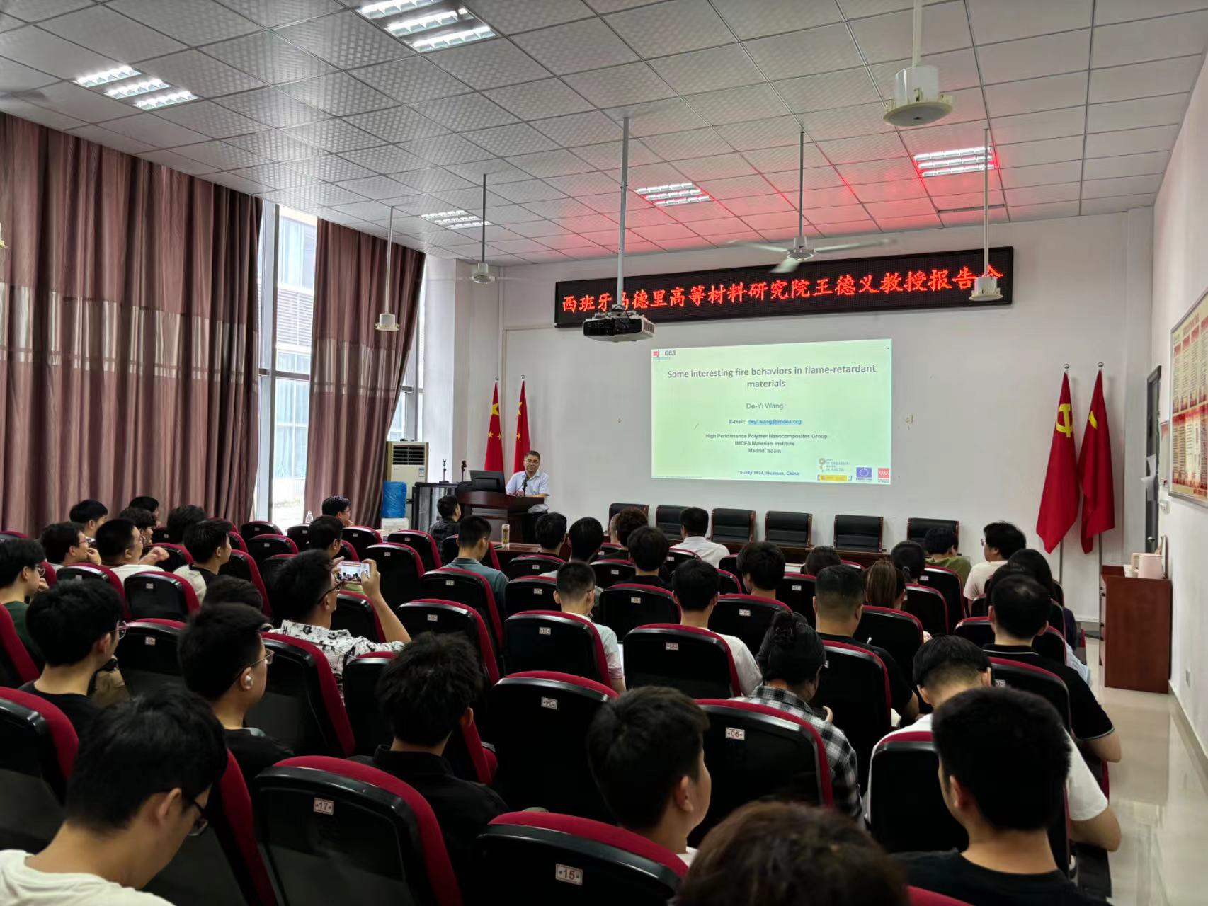 7月19日下午,应安徽理工大学科研部和材料科学与工程学院邀请,西班牙马德里高等材料研究院资深科学家/研究教授,中国-西班牙科技协会主席王德义在材料学院B118报告厅为我校师生作题为“阻燃材料中一些有趣的着火现象”的学术报告。材料科学与工程学院院长闵凡飞,公共安全与应急管理学院党委副书记(主持工作)副院长聂士斌,材料学院和安全学院相关专业教师,研究生等近百人参加了报告,报告会由材料学院副院长程国君主持。