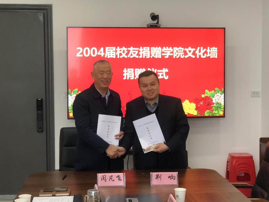 院长闵凡飞与校友代表中煤天津设计工程有限责任公司华东公司支部书记、总经理荆响签订捐赠协议;刘艳为校友代表淮南瞪羚产业园有限公司董事长于洪国颁发了捐赠证书。于洪国作为捐赠校友代表分享了在母校的求学经历,衷心感激母校老师们的辛勤培育,表示在学校和学院获取的专业知识和技能为工作打下了坚实的基础。返校后看到蓬勃发展的学院,身为一名材料学子倍感荣幸。