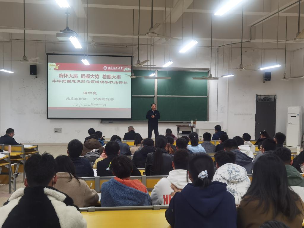 为进一步做好意识形态工作,教育引导广大师生把好理想信念“总开关”,守好高校意识形态“责任田”,11月17日下午,材料学院邀请校党委宣传部、统战部常务副部长田中良在明理104教室做题为“胸怀大局、把握大势、着眼大事,牢牢把握意识形态领域领导权话语权”的专题讲座。讲座由院党委书记夏邦权主持,学院全体党员参加。