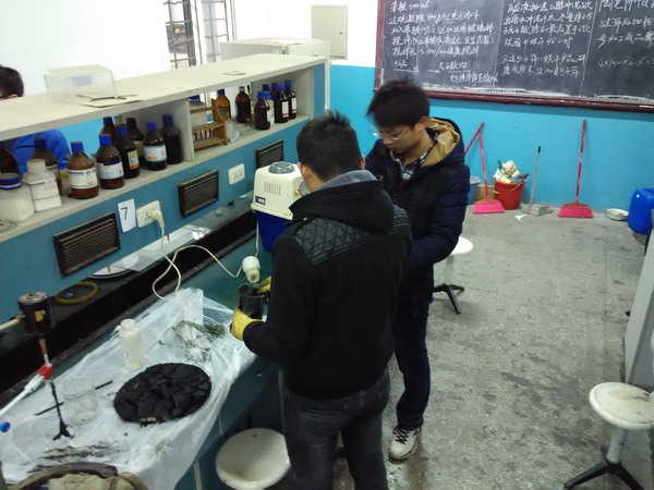 考虑苯胺聚合反应不需要加热也不需要高温高压的特点,在实验室没有中试反应釜的条件下,老师和同学们因地制宜,自己动手,创新性地使用简易工具搭建了可以量产聚苯胺的装置。在老师们的带领下,材料学院2011级高分子专业学生不畏严寒,热火朝天地进行实验,成功合成了公斤级聚苯胺纳米导电粉末,完全满足后续高分子加工的需要。