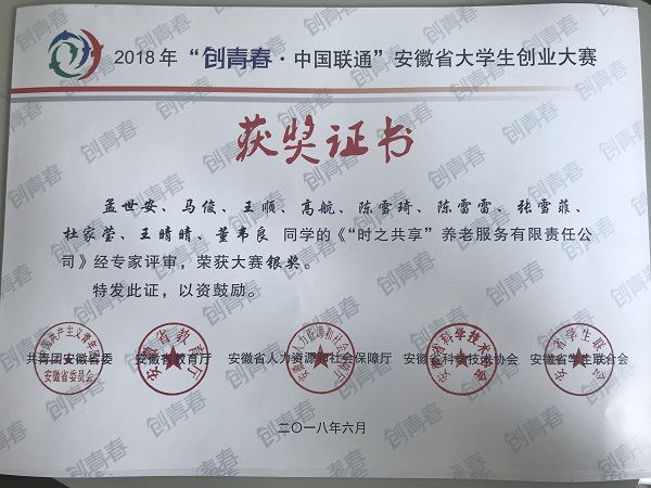 业精于勤,致力于可持续发展;形成于思,追求光阴共享理念!材料科学与工程学院“时之共享”有限责任公司服务团队像是越冬后的第一株嫩苗,以“共享光阴”的先进理念为甘露,以“合作创新实践”为阳光迅速地成长于众人面前,以校赛二等奖的成绩晋级2018年第八届“创青春·江南化工杯”安徽省大学生创业大赛省赛,并最终斩获公益创业组银奖,充分展现了安徽理工大学学子先进的创新意识和服务社会的奉献精神。