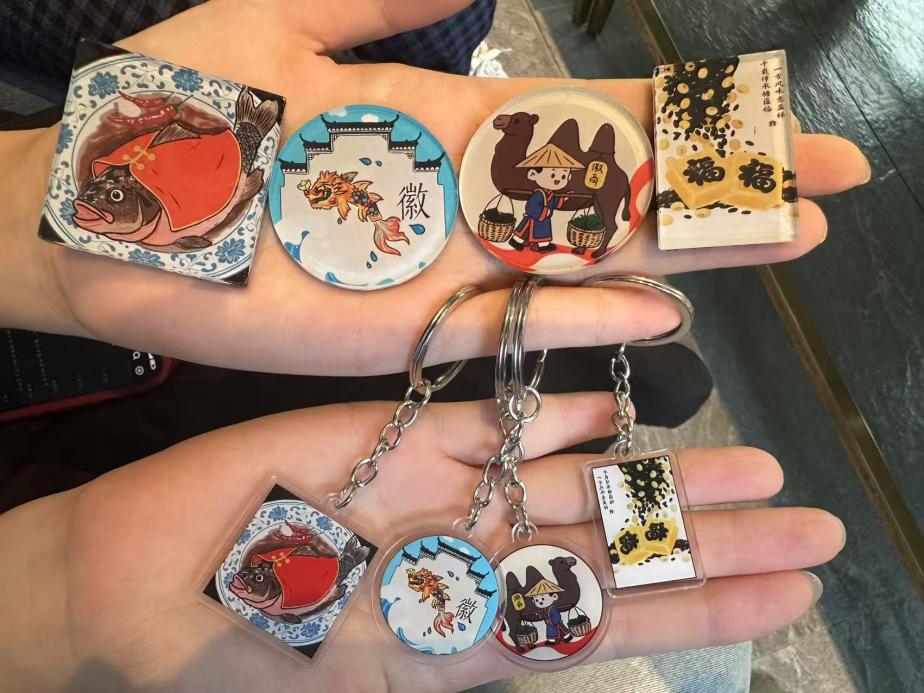 针对这一现状,团队成员结合材料专业知识,以年轻人喜爱的“文创”为切入点,设计出“徽骆驼·货郎小哥”“独占鳌头·跃龙门”“臭鳜鱼·美食精灵”“嵌字豆糖·福运方块”等融入徽商元素的文创产品。队员们向参加访谈对象以及部分大学生赠送原创文创产品,并讲解徽文化内涵,激发大家对徽文化和徽商精神的兴趣,增强青年人对中华优秀传统文化的认同感。这份认同感,不仅是助力青年大学生塑造健全人格、砥砺奋斗意志的丰厚养分,更是铸牢中华民族共同体意识、坚定文化自信的坚实基石。
