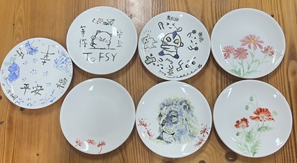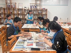 教学过程中,王静对陶瓷釉料、图案颜色、陶艺工具、陶艺方法等方面向参加活动的同学进行了讲解。讲解之后,王静指导同学们挑选泥料的大小,以切和捏的方式感受泥料手感,以擀和拍的方法使泥料光滑,然后选位置刻图案、刻细节,将设计好的图案按进泥料里进行敲打,静止留存。接着,她带着同学们一起给陶瓷盆进行彩釉绘画。她介绍了釉上彩绘所使用的特殊釉料颜色和特制毛笔,用毛笔勾勒极细的线条,用釉料创意出色彩斑斓的图画。制陶过程中,学生们耐心聆听,互相帮助,他们从生疏到熟练,将陶土捏成各种造型,用笔绘制出各具特色的陶瓷盘。同学们在欢声笑语中,亲手制作了极具特色的文创作品。