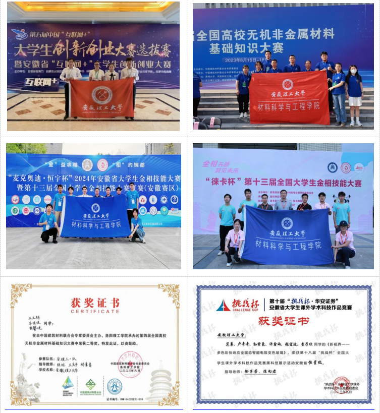 ◆教学与科研相辅相长,专业注重培养学生创新能力,每年举办“中国国际大学生创新大赛、全国大学生课外学术科技作品竞赛、中国大学生创业计划竞赛、无机非金属材料基础知识大赛、大学生金相技能大赛、微结构设计大赛、混凝土材料设计大赛等,为学生提供了广阔的学科竞赛平台。近5年,在校生获得“挑战杯”中国大学生创业计划竞赛、中国国际大学生创新大赛、全国大学生数学建模竞赛、全国大学生金相技能大赛、全国大学生节能减排社会实践与科技竞赛、安徽省大学生创新创业大赛、安徽省“创青春”大学生创业大赛等近百项国家级、省部级竞赛奖励。