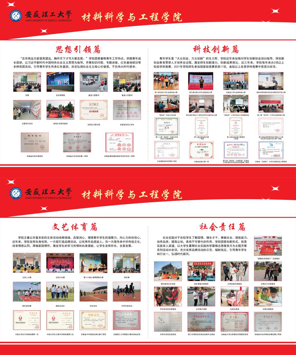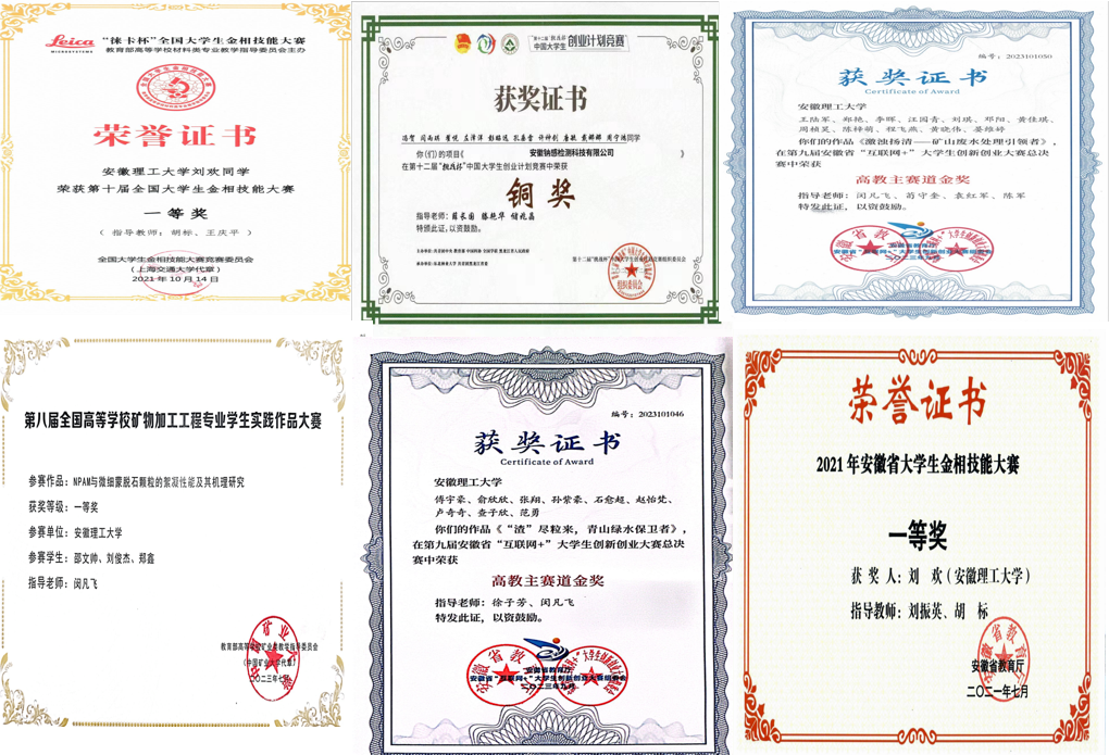 获全国高校活力团支部1次,安徽省十大杰出青年志愿者1人,中国红十字会第八次会员代表大会代表1人(全国学生代表3人),安徽省百优大学生荣誉称号1人,安徽省优秀共青团员1人,第三十五届中国大学生手球锦标赛甲组第一名2人,第三十五届中国大学生手球锦标赛男子甲组第二名1人,安徽省大众空手道锦标赛女子高校组个人组手57KG第二名1人,安徽省第六届校园读书创作月活动一等奖2人,二等奖1人,三等奖1人。近五年,获得全国大学生英语竞赛特等奖、全国大学生金相大赛一等奖、全国高等学校矿物加工工程专业学生实践作品大赛一等奖、全国大学生节能减排社会实践与科技竞赛三等奖、安徽省“互联网+”大学生创新创业大赛二等奖、“挑战杯”安徽省大学生创业计划竞赛二等奖、安徽省百所高校百万大学生科普创意创新大赛一等奖等省级以上奖项190余项。