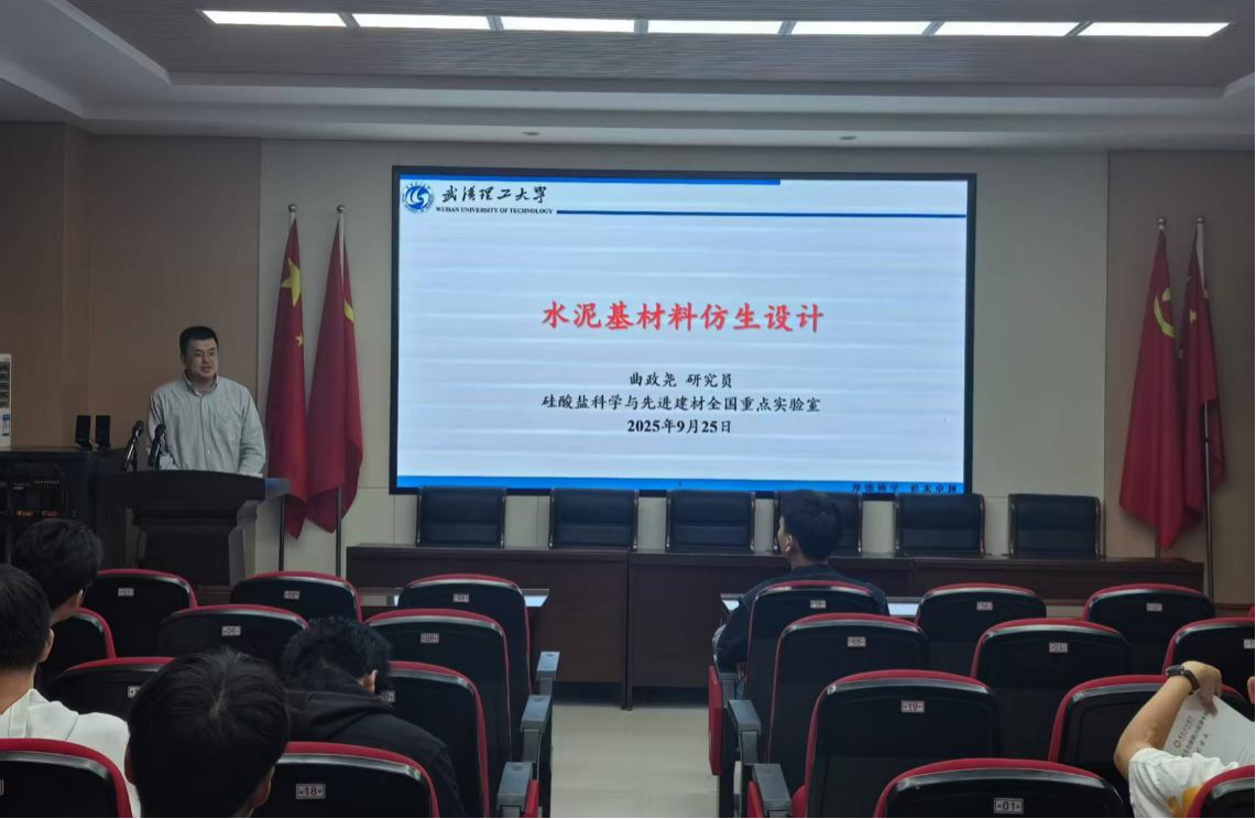 曲政尧研究员在材料学院崇义楼B118报告厅作了题为《水泥基材料仿生设计》的学术报告。首先他阐述了仿生设计背景与原理,随后详细介绍了其课题组借助仿生设计在水泥基材料方面的创新方向,包括:层状组装材料、透明水泥、蛋白质改性水泥、可回收凝胶材料等相关研究方向。同时曲政尧还分享了材料仿生设计过程中所遇到的挑战与解决策略,并提出了将仿生设计与机器学习相结合的创新思路,这一跨学科的研究方向有望为水泥基材料领域带来新的突破。