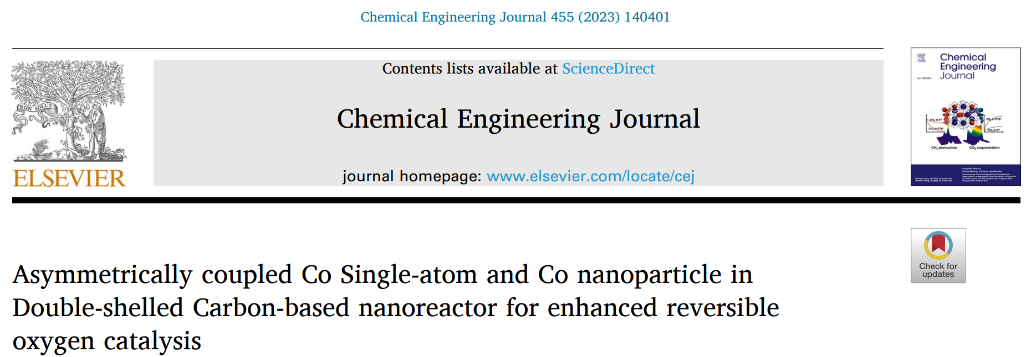 发展了一种简单的“化学蚀刻/原位捕获”合成策略,制备了负载有尺寸不对称的Co单原子和金属Co纳米粒子的双壳碳基纳米盒。该催化剂可利用其独特的双壳层结构,增大其反应面积,加快催化过程中的传质和传荷,并实现催化活性的大幅度提高。更为重要的是,金属单原子和纳米粒子之间的强化学耦合,可优化电催化过程中反应中间体的吸附/脱附能垒,因此提升了可逆氧电催化活性。相关研究成果以“Asymmetrically coupled Cosingle-atom and Co nanoparticle in double-shelled carbon-based nanoreactor for enhanced reversible oxygen catalysis”为题发表在Chemical Engineering Journal (DOI: 10.1016/j.cej.2022.140401)。