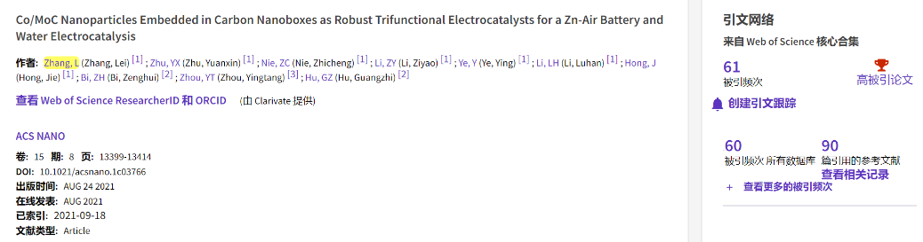 另悉,据2023年3月ESI数据库显示,我校张雷教授以安徽理工大学为第一单位在ACS Nano期刊上发表的研究论文“Co/MoC Nanoparticles Embedded in Carbon Nanoboxes as Robust Trifunctional Electrocatalysts for a Zn-air Battery and Water Electrocatalysis”(2021, 15, 13399-13414)被ESI数据库遴选为高被引论文。ACS Nano是国际ESI材料学科著名学术期刊,最新影响因子IF = 18.027,为自然指数期刊和JCR/中科院分区双一区TOP期刊。
