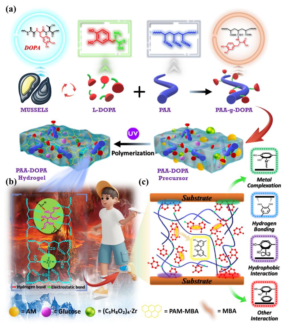图1 PAA-Dopa-Zr4+水凝胶的制备工艺和设计策略