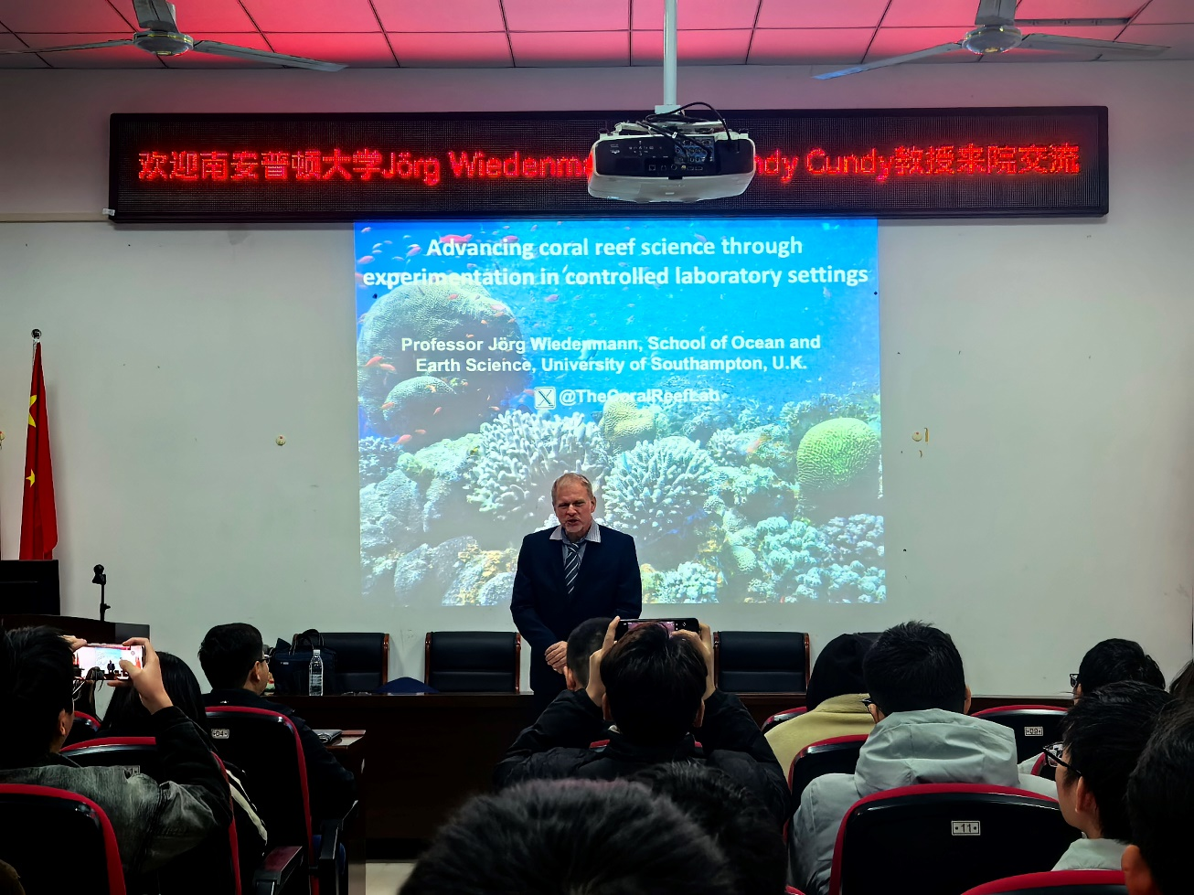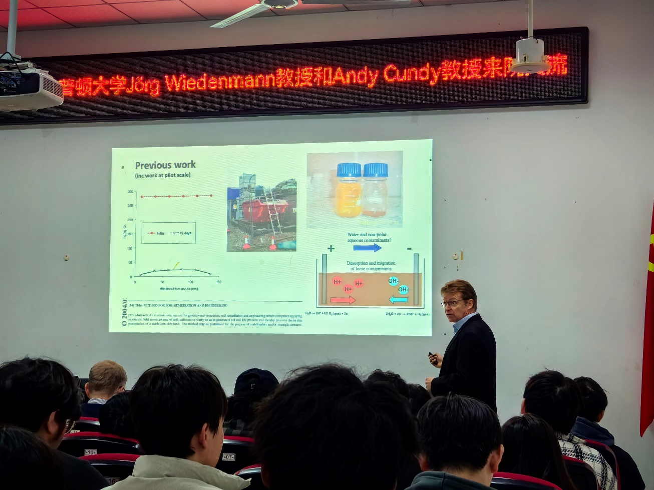 Jörg Wiedenmann教授和Andy Cundy教授在材料学院B118报告厅分别作了题为《Advancing coral reef science through experimentation in controlled laboratory settings》和《Cross-linking geopolymer and marine science: developing novel, waste-based, materials for marine protection and conservation》的学术报告。