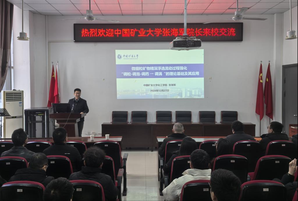 张海军院长进行了一场题为《微细粒矿物精深浮选流动过程强化——“调粒-调泡-调药→调涡”的理论基础及其应用》的学术汇报。报告首先介绍了微细粒矿物浮选的重要性,并强调微细粒矿物的高效矿化是提升浮选效率的核心问题。在汇报中,张院长详细阐述了“调粒-调泡-调药→调涡”的新理论,这一理论不仅包括传统的微粒、气泡和药剂的调节,还创新性地引入了“调涡”的概念,以期通过微涡强化来提升微细粒矿物的回收率。