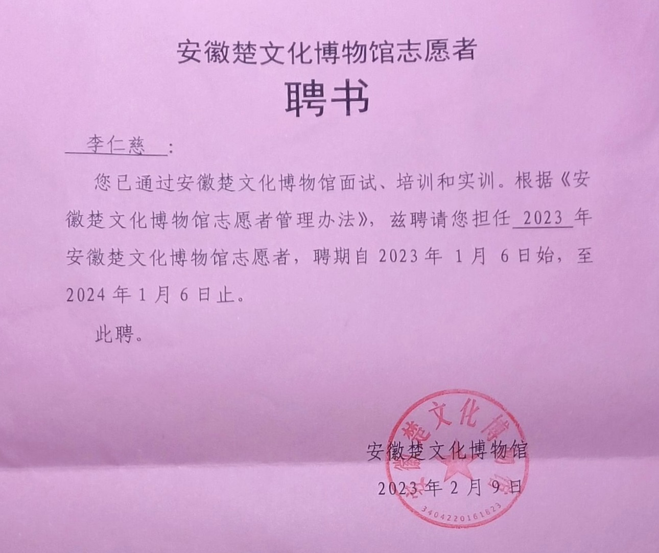 李仁慈和志愿者们主要负责讲解博物馆一楼“安徽楚文化”展厅的相关文物,在实际讲解中,遇到了来自世界各地,年龄背景各不相同的游客——有沉迷于文物历史的孩童,有痴迷于悠悠古韵的老人,还有向往中国文化的国际友人;有前来对照文物学习的考古专业学生,有致力于乡镇发展的政务工作者,还有自豪于家乡悠久历史的本地劳动者。在空余时间,她也会帮助博物馆的咨询处和接待处,进行游客参观导览,组织博物馆相关活动和迎接服务等,整个志愿服务期间充实且有意义。