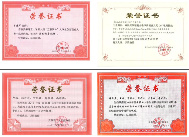 李建军,男,工学博士,教授,硕士生导师,安徽理工大学固废资源化与生态功能材料团队首席专家。中国硅酸盐协会固废与生态材料分会学术委员,安徽省硅酸盐协会理事,J. Geosci. Environ. Protect.、J Multifunct. Mater. Photosci等国际期刊编委。2016-2017年在澳大利亚伍伦贡大学“Institute for Superconducting & Electronic Materials”研究所做访问学者。从事资源循环、无机非金属等专业的教学科研工作,研究方向:煤基固废资源化利用、污水磁处理及应用、吸附与催化转化技术。近5年来,主持参加国家和省部级科研项目20余项,横向开发课题8项,省部级教学研究项目6项,获全国煤炭行业教学成果一等奖1项、省级教学成果奖5项。指导学生获得中国研究生智慧城市技术与创意设计大赛全国二等奖1项,获“互联网+”、“挑战杯”等省部级奖励6项;2020年获安徽理工大学“互联网+”优秀指导教师。在 ACS Appl. Mater. Interfaces、J. Am. Ceram. Soc.等国内外学术期刊发表研究论文40余篇,其中SCI收录30余篇,授权国家发明专利16项。出版学术专著、教材3部。